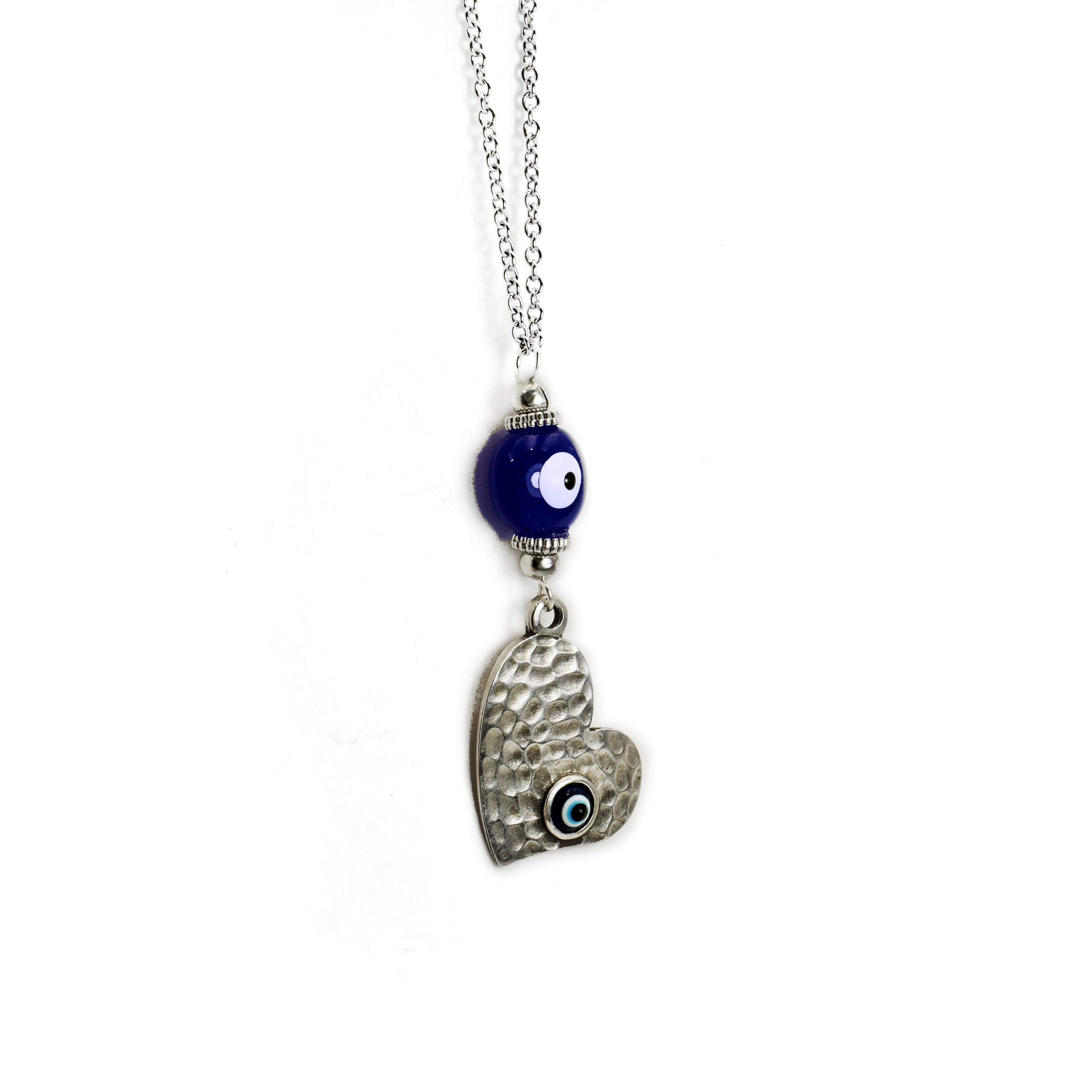 Beautiful handcrafted car mirror charm made of silver tone metal chain of a blue ceramic evil eye bead and silver tone metal heart charm.