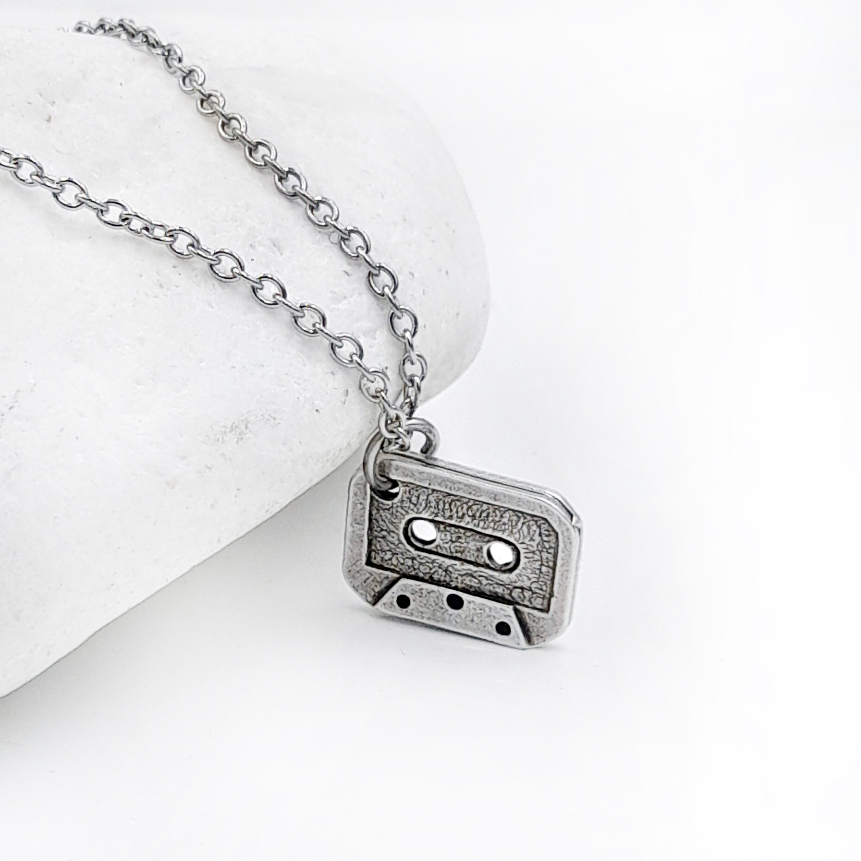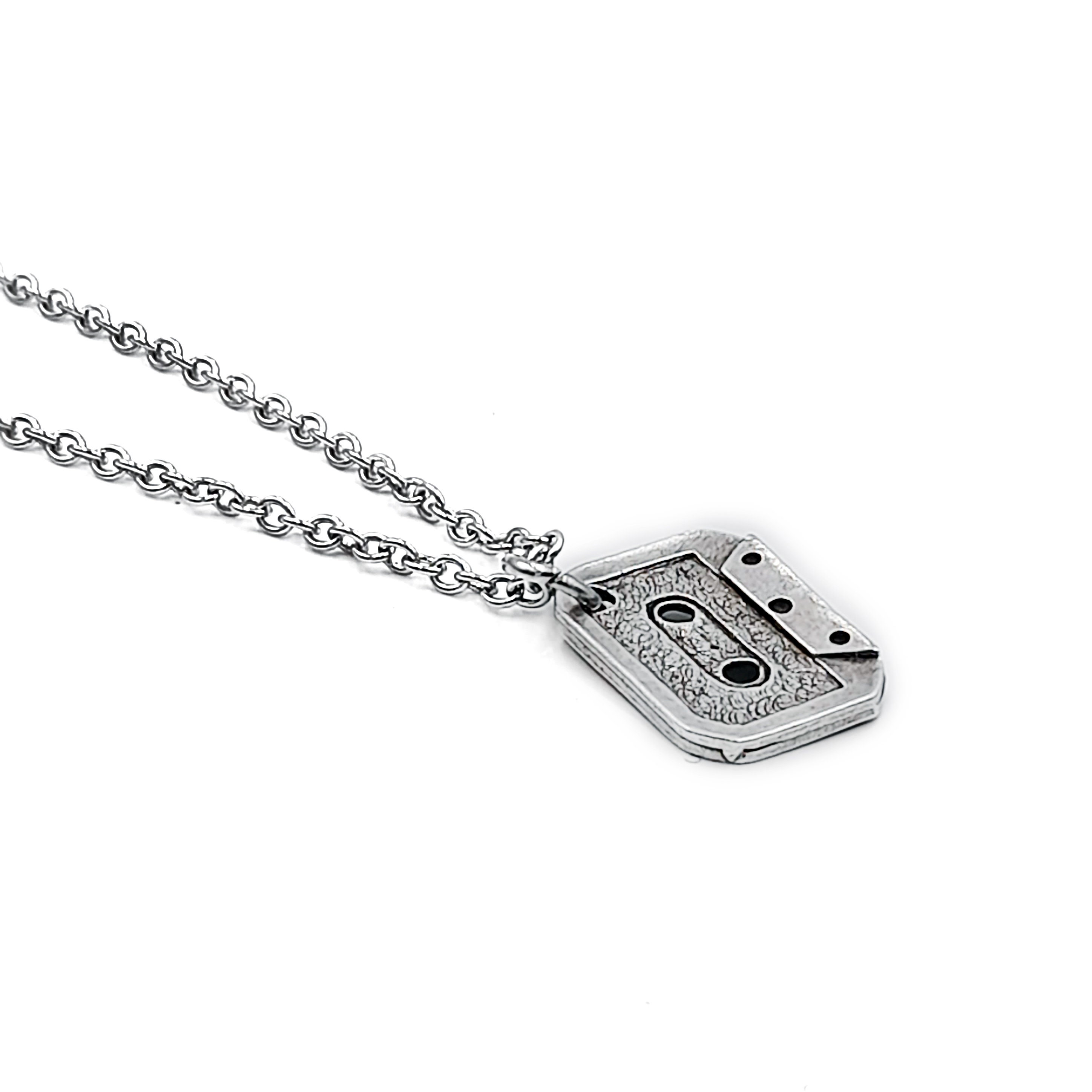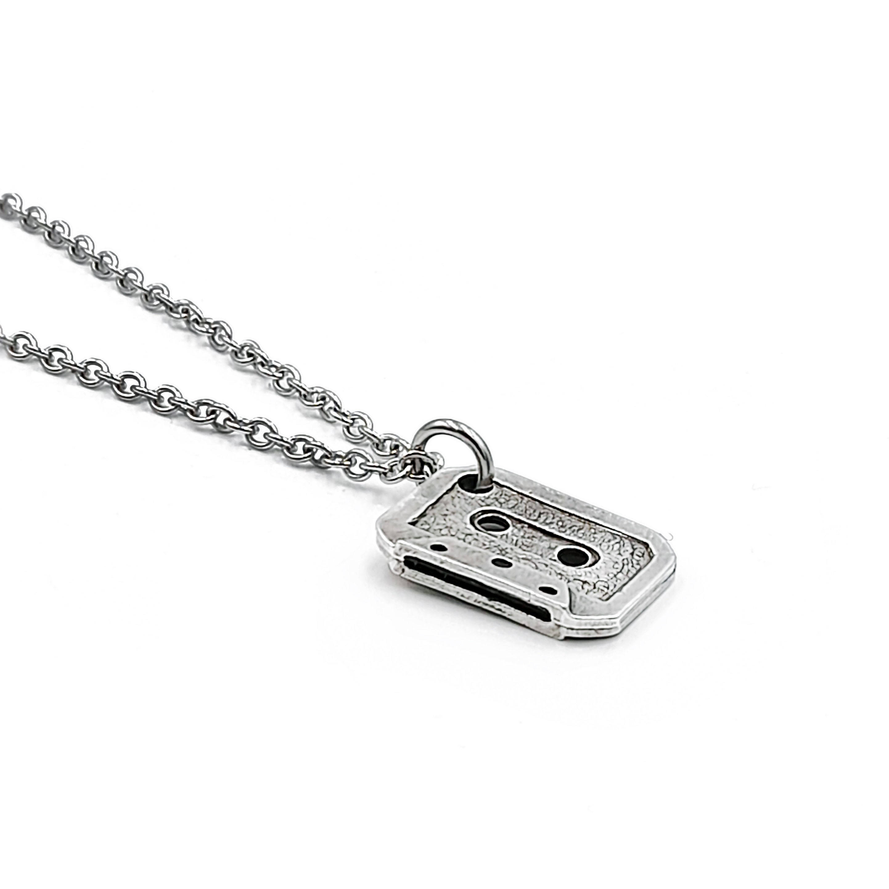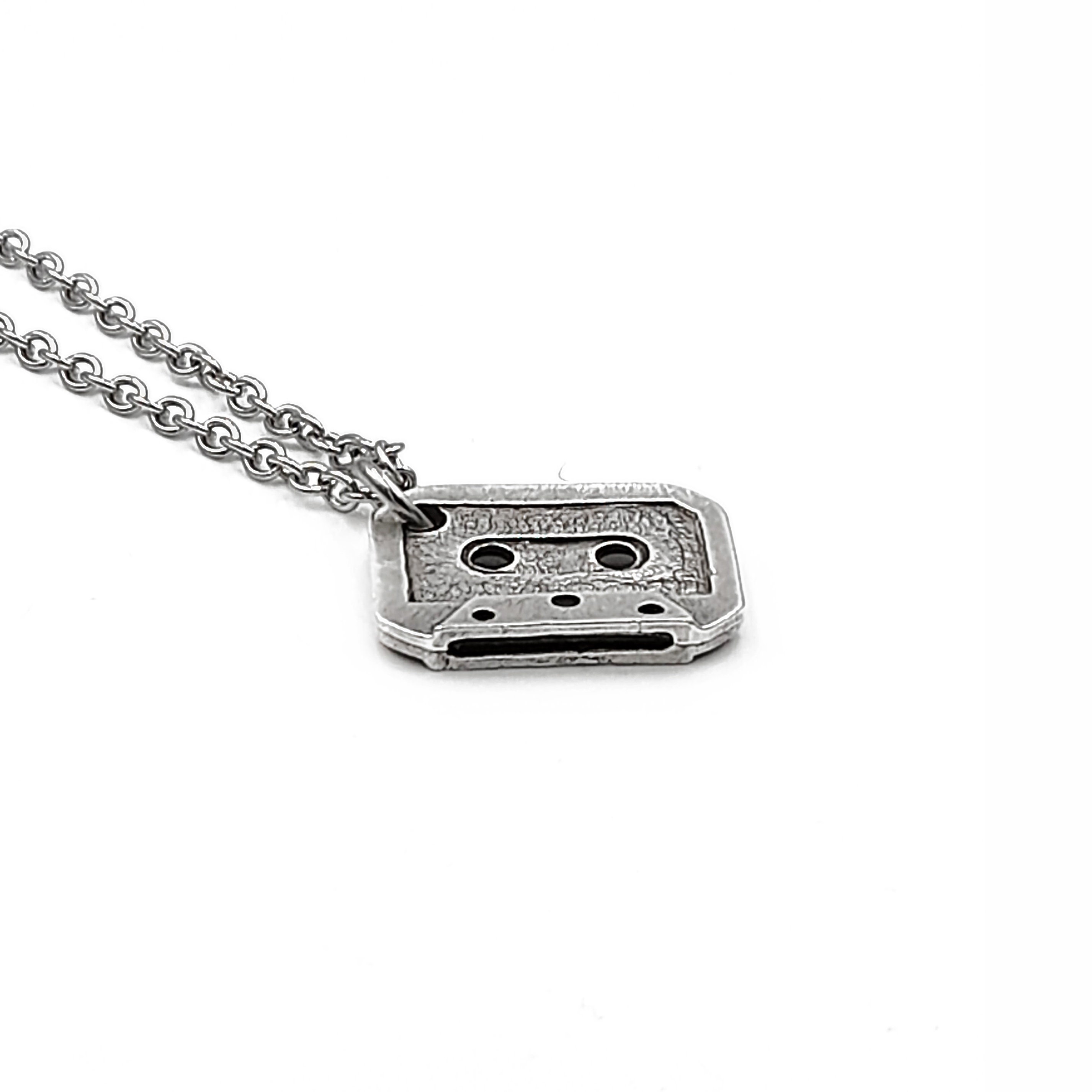 Handcrafted necklace created from small silver tone cassette tape pendant which hangs from stainless steel chain. Chain can be made to any length from 14 to 26 inches. Please choose the necklace length you would like fron the drop down menu.