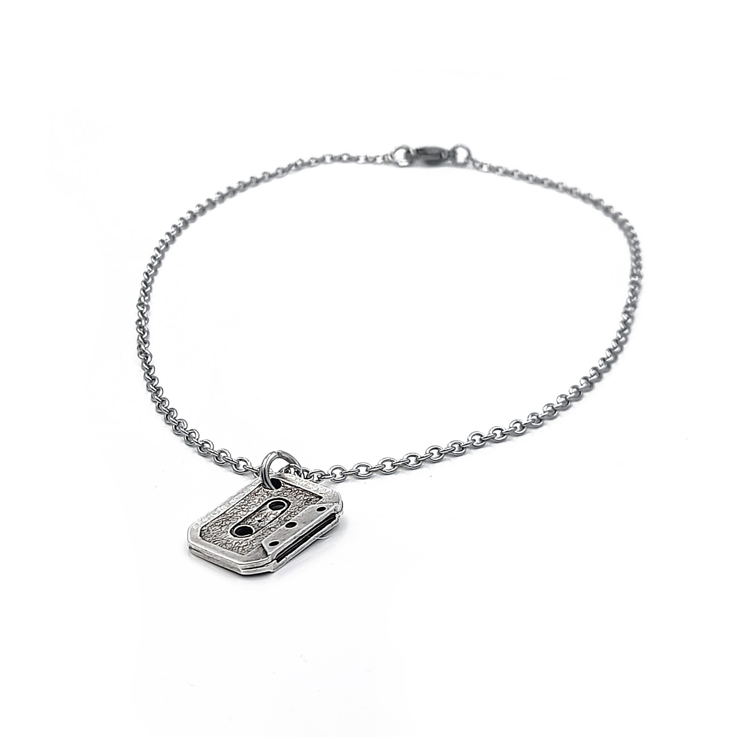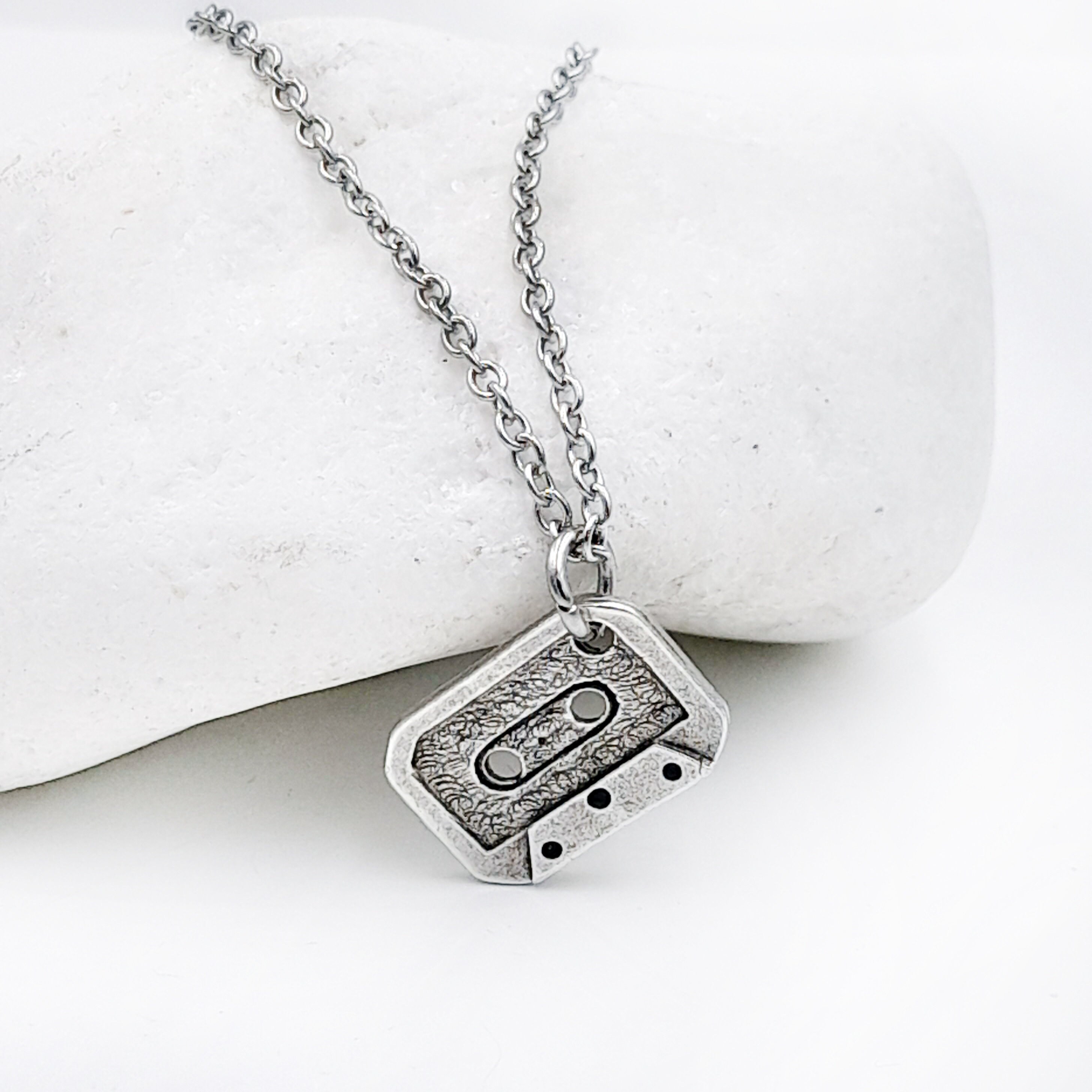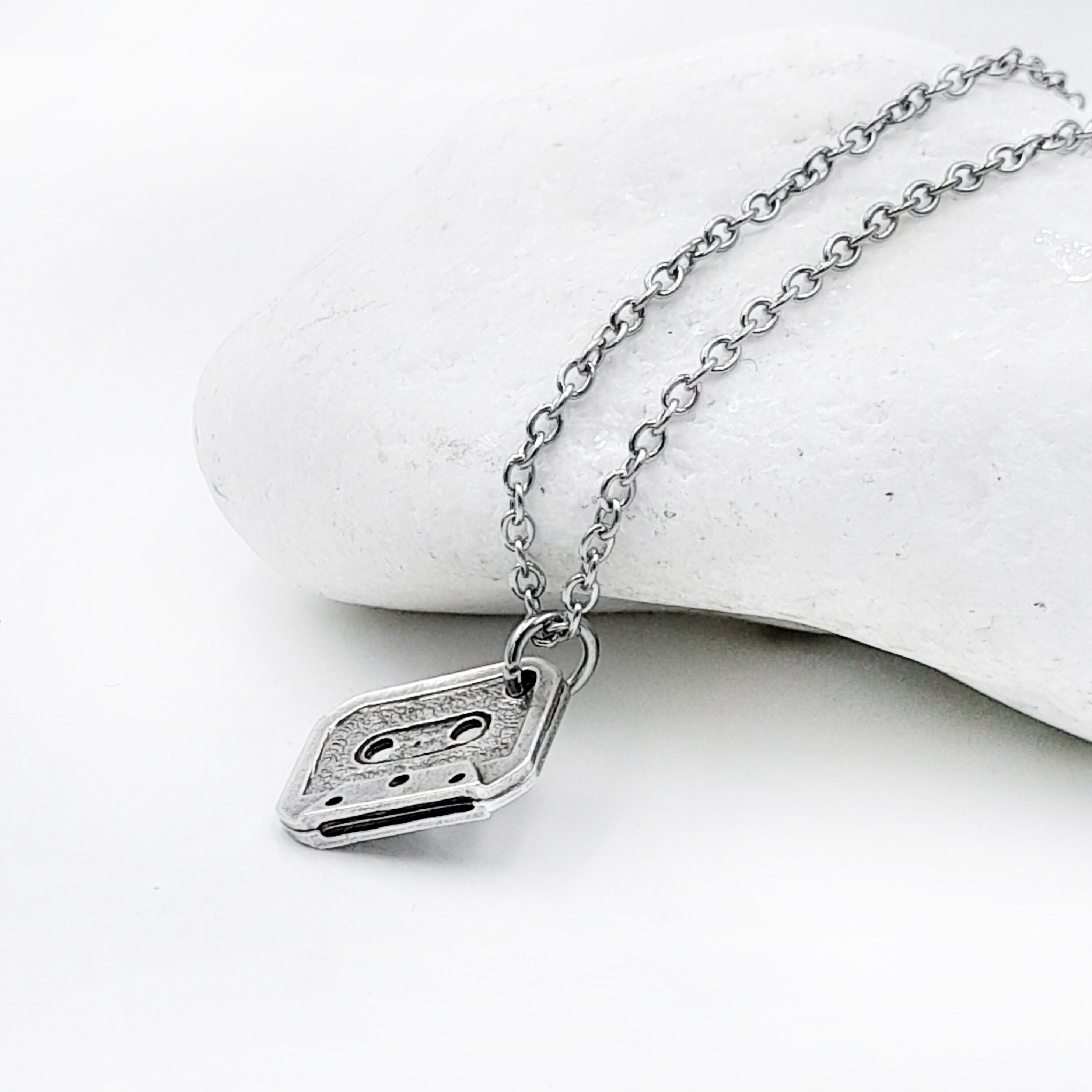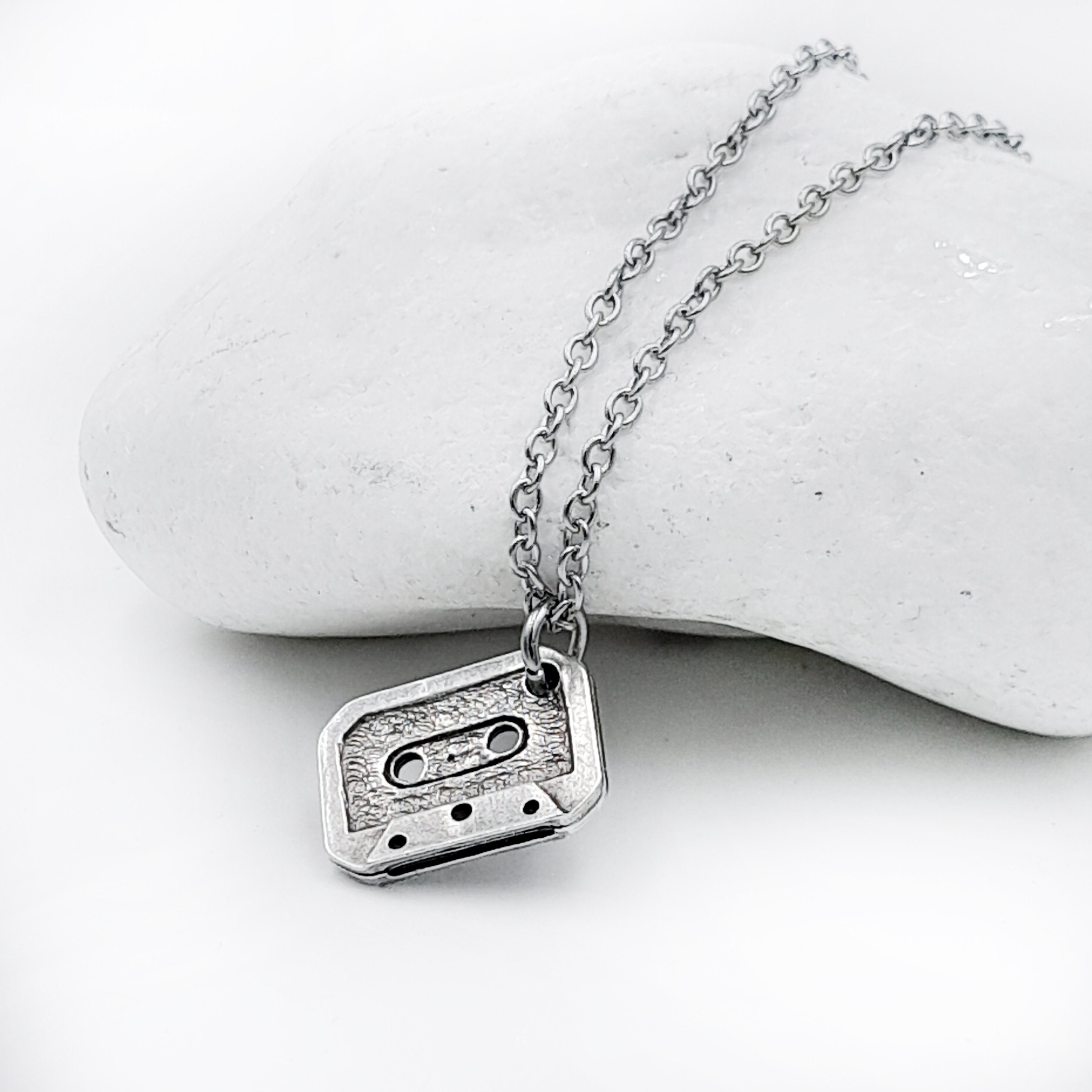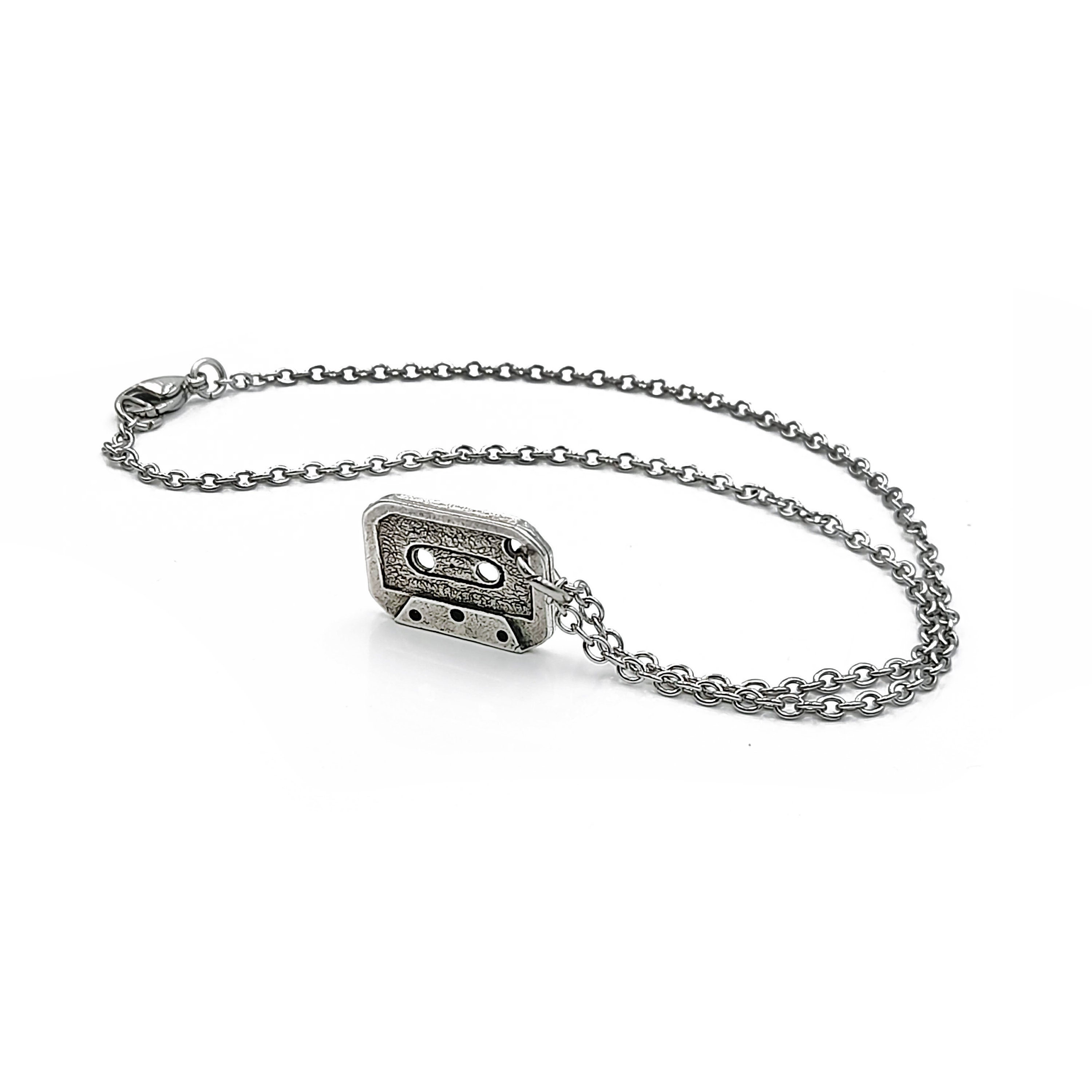 Handcrafted necklace created from small silver tone cassette tape pendant which hangs from stainless steel chain. Chain can be made to any length from 14 to 26 inches. Please choose the necklace length you would like fron the drop down menu.