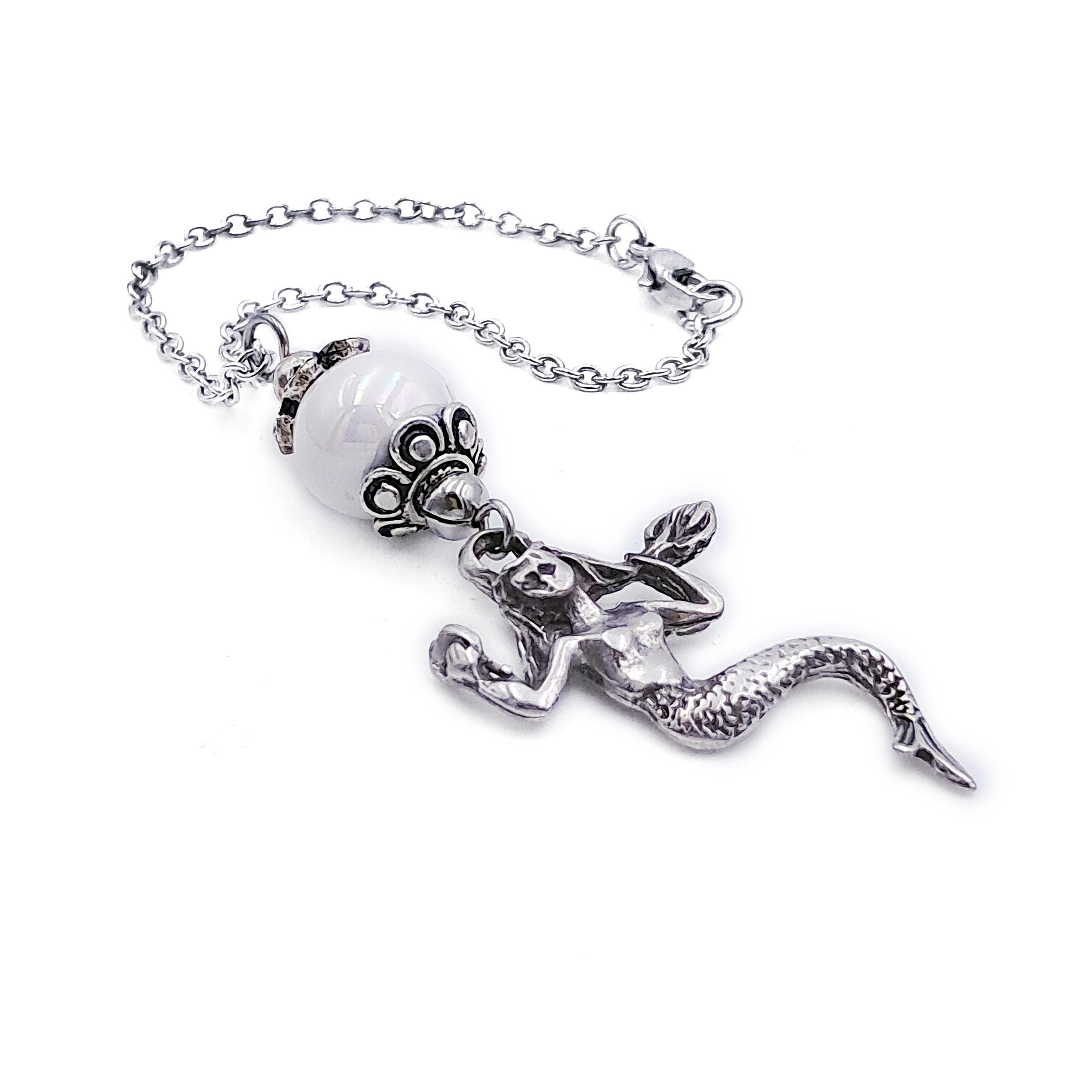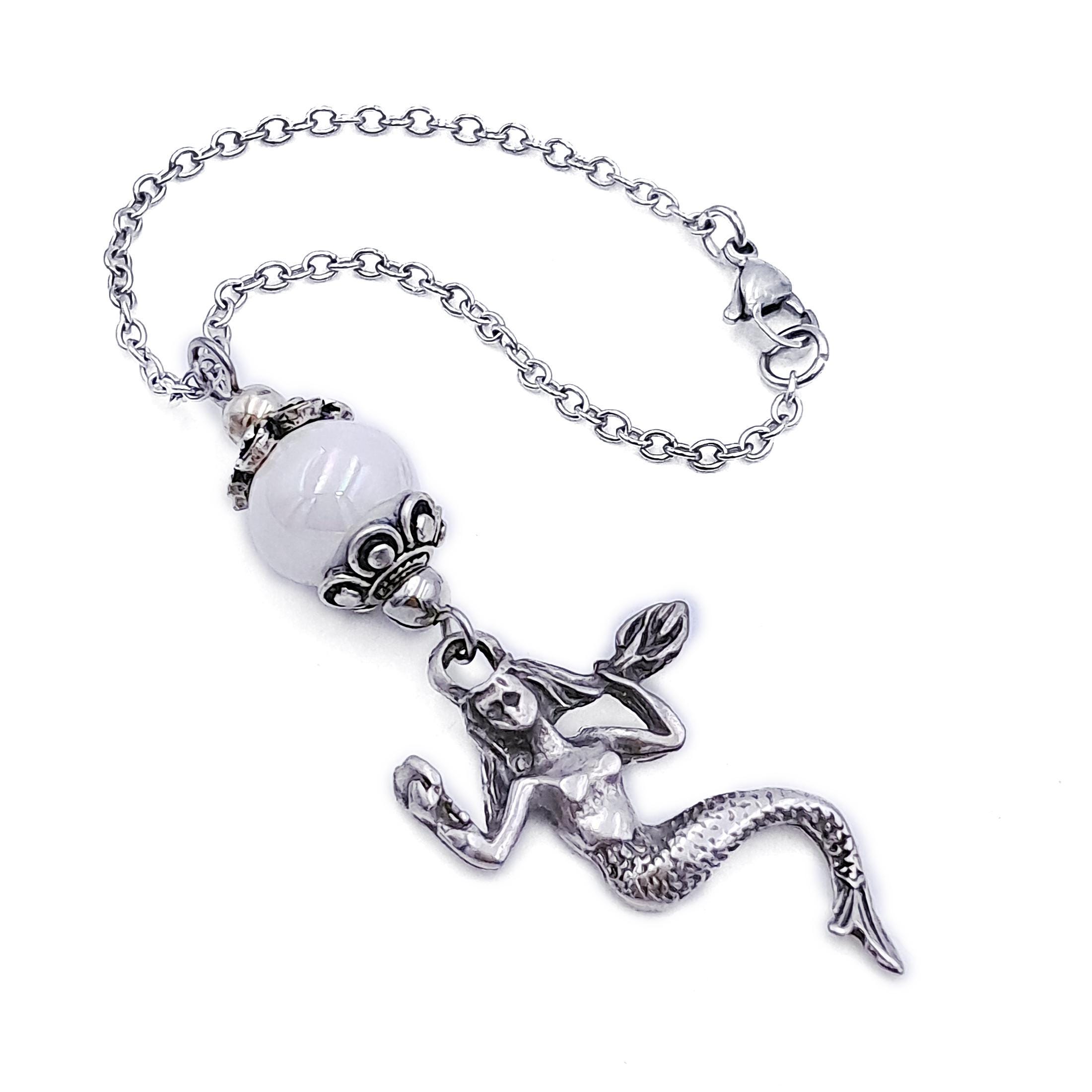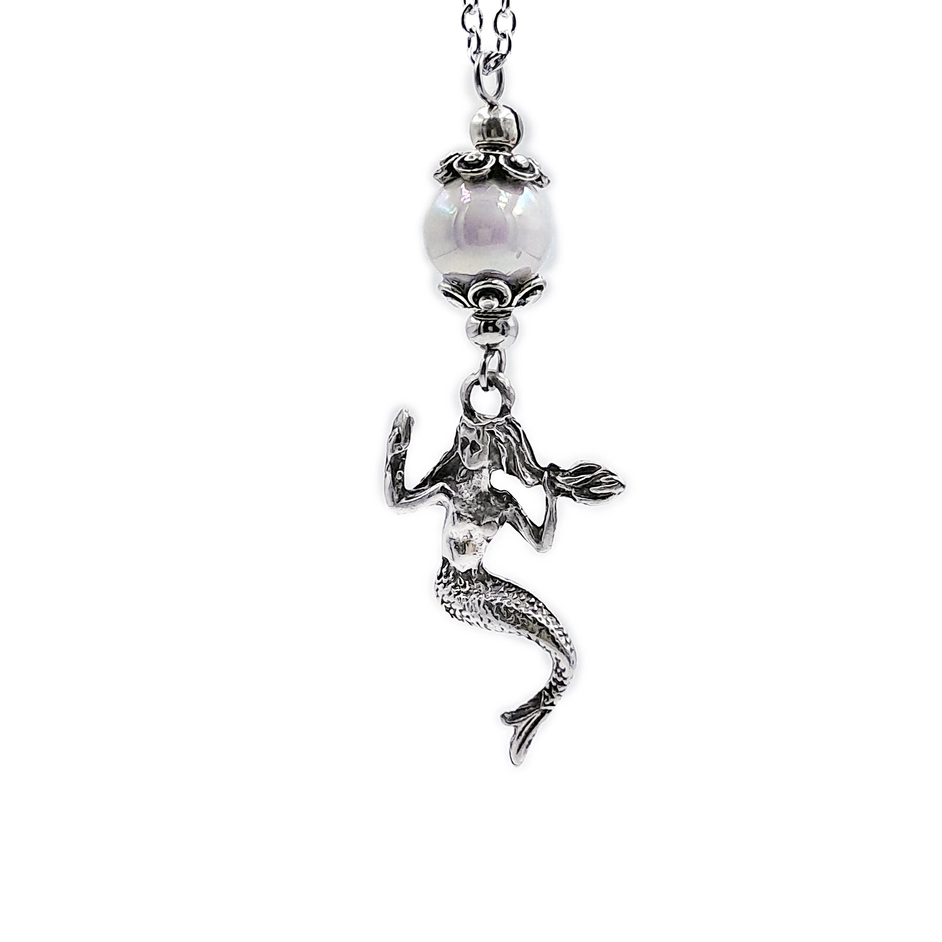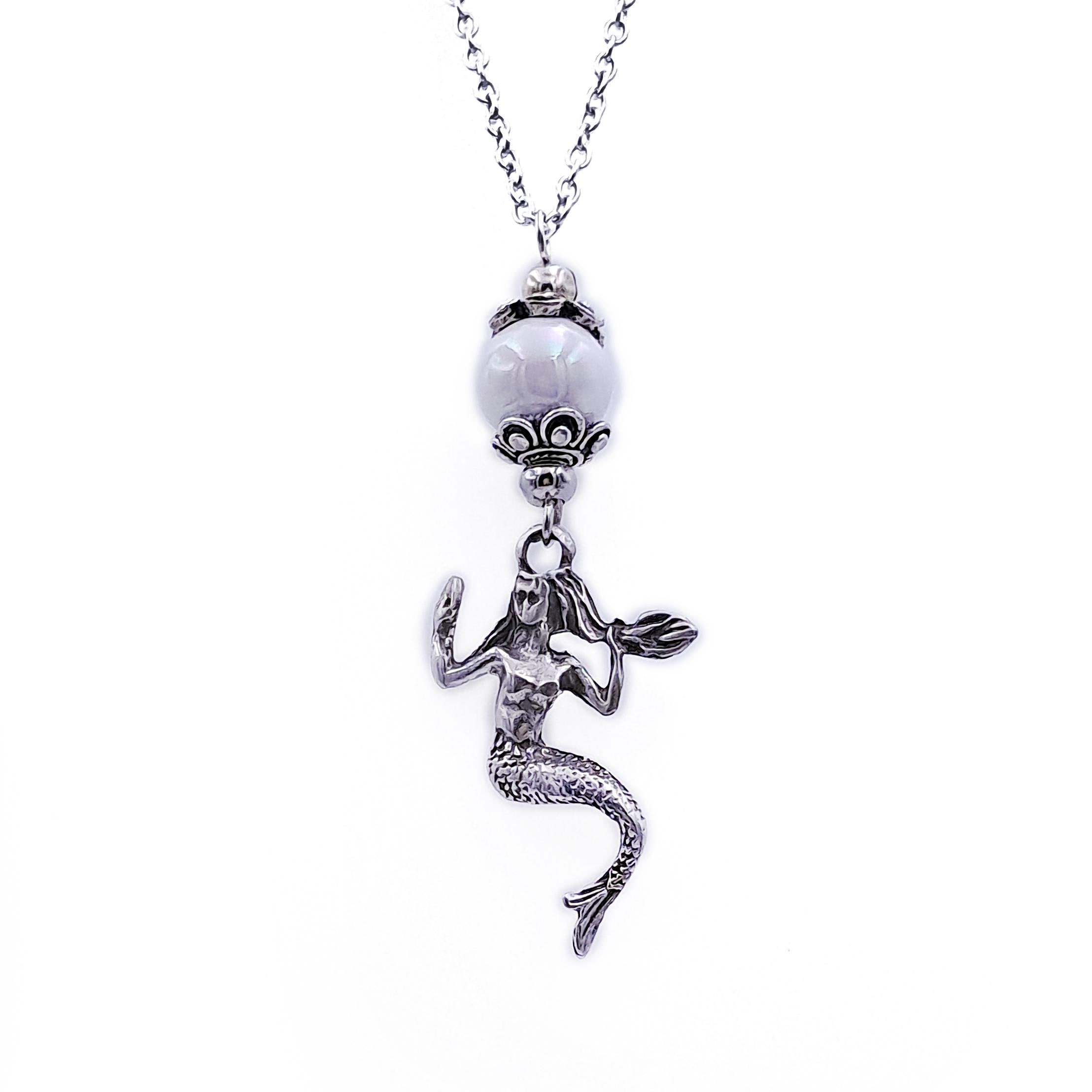 Stainless steel chain, ceramic bead of your choice, and a silvertone metal mermaid charm.