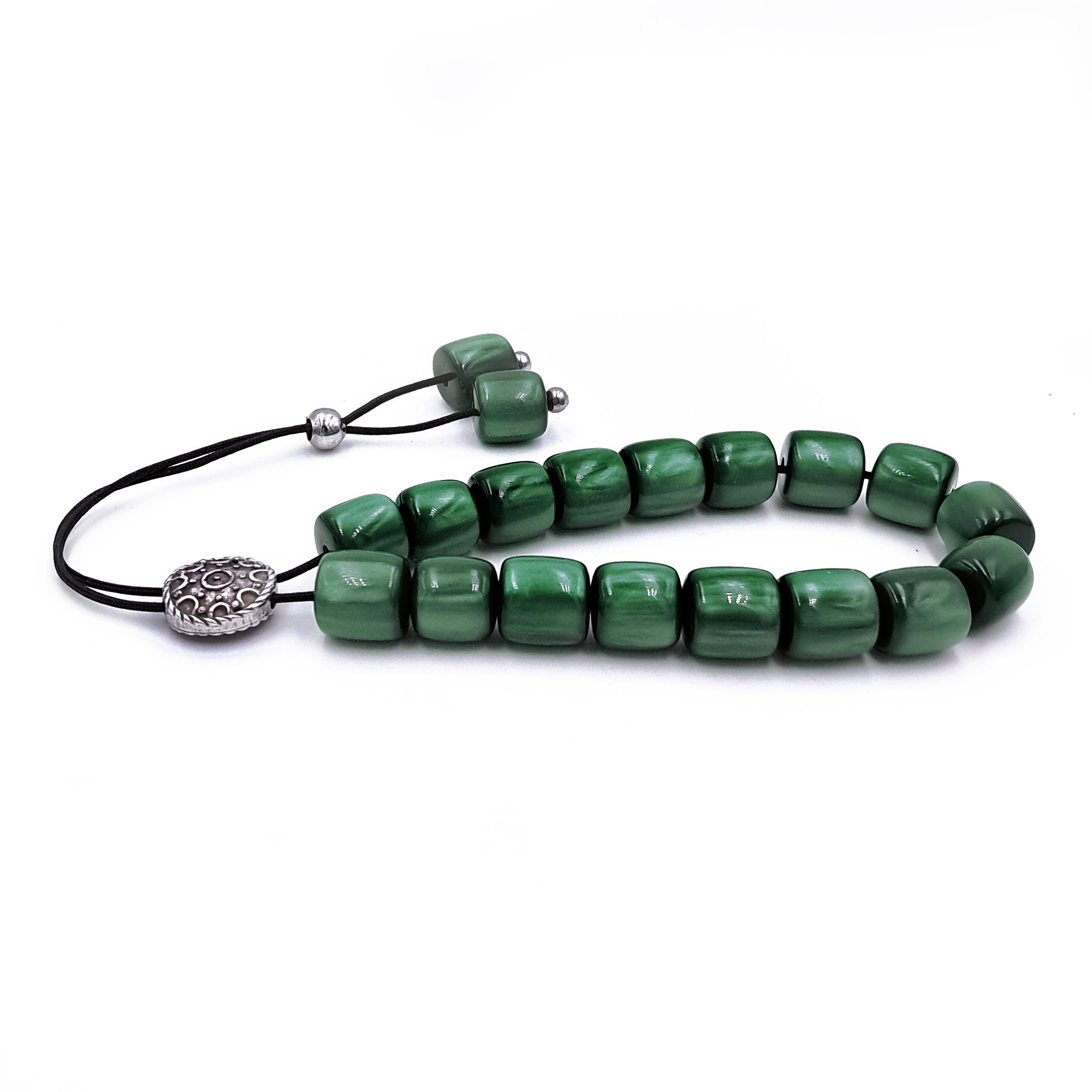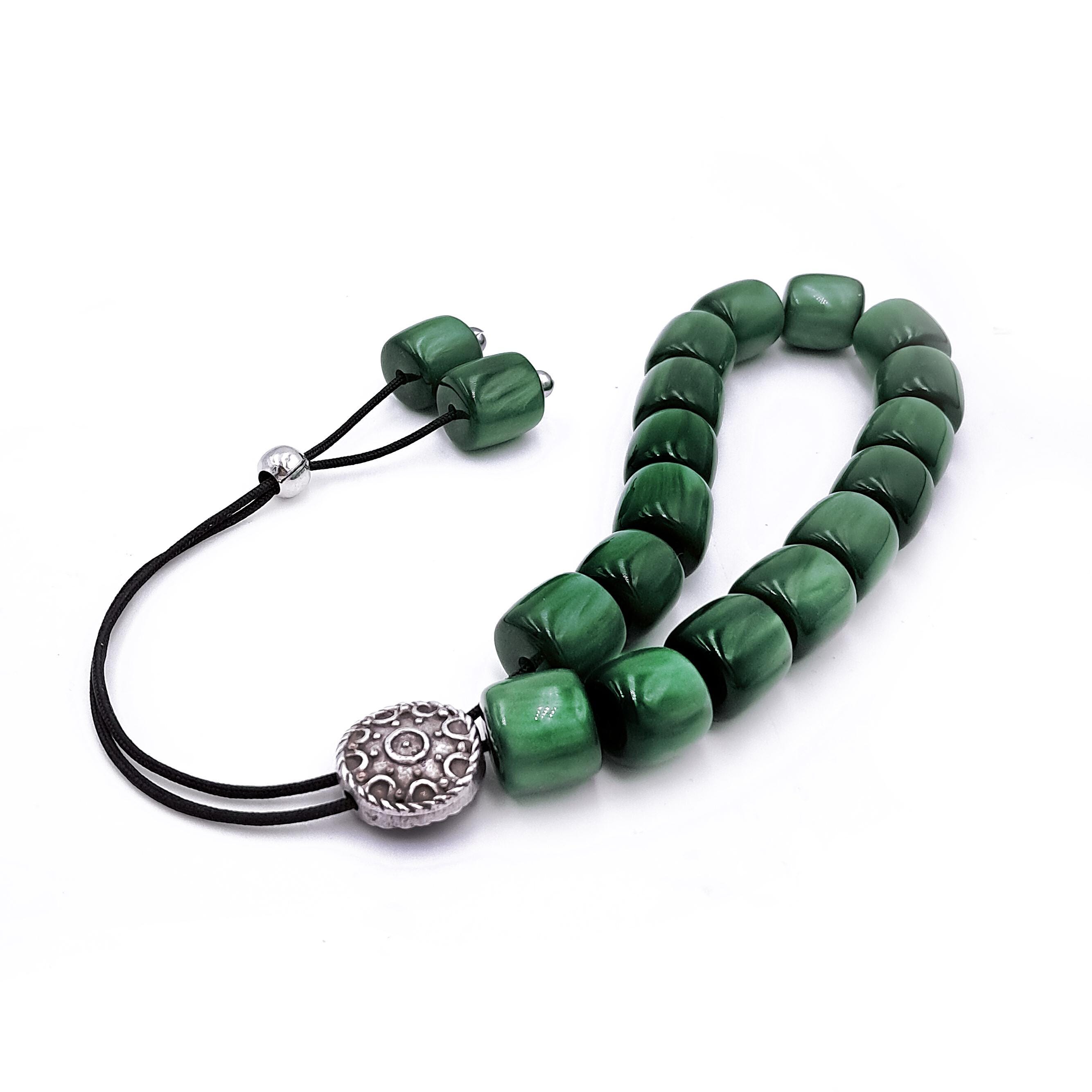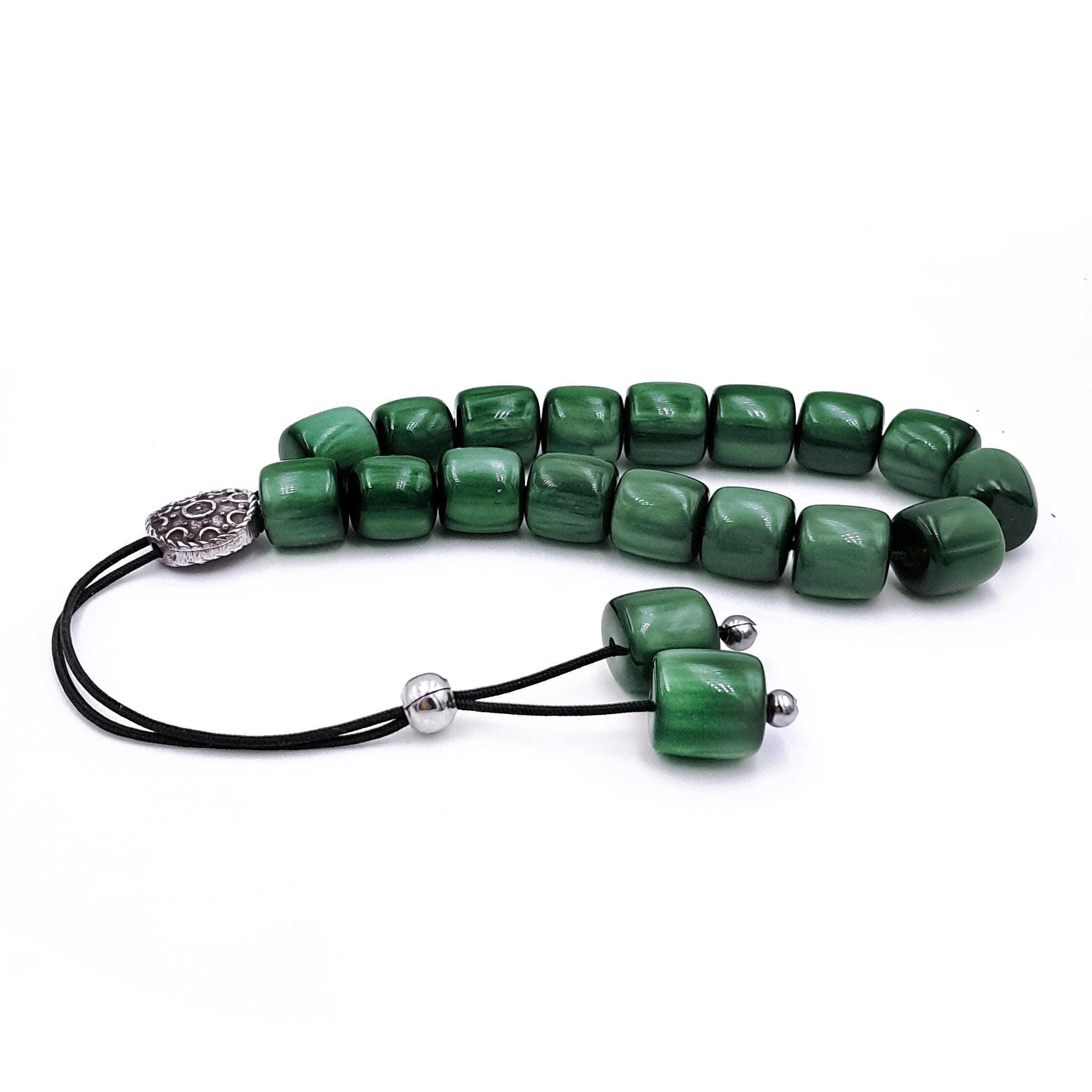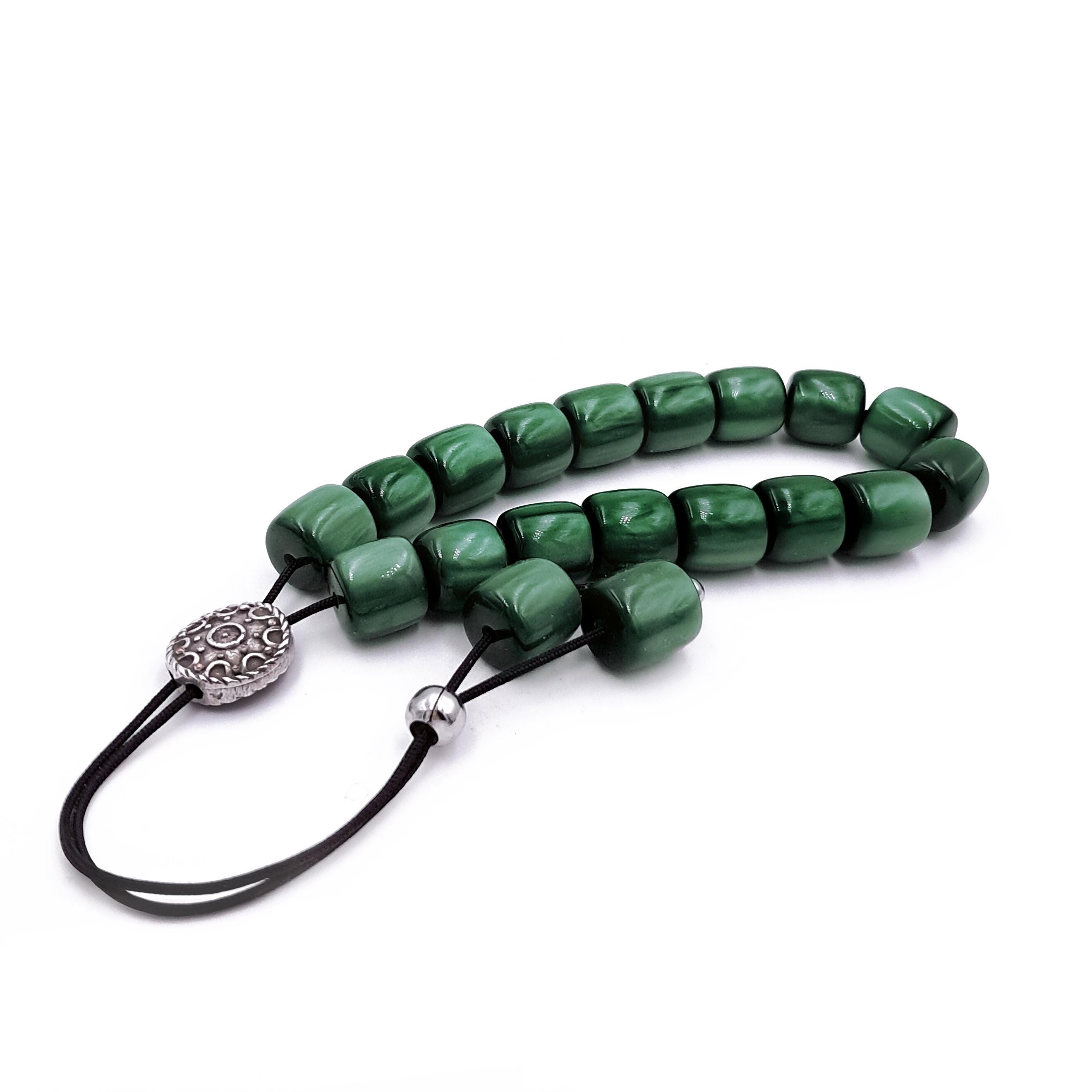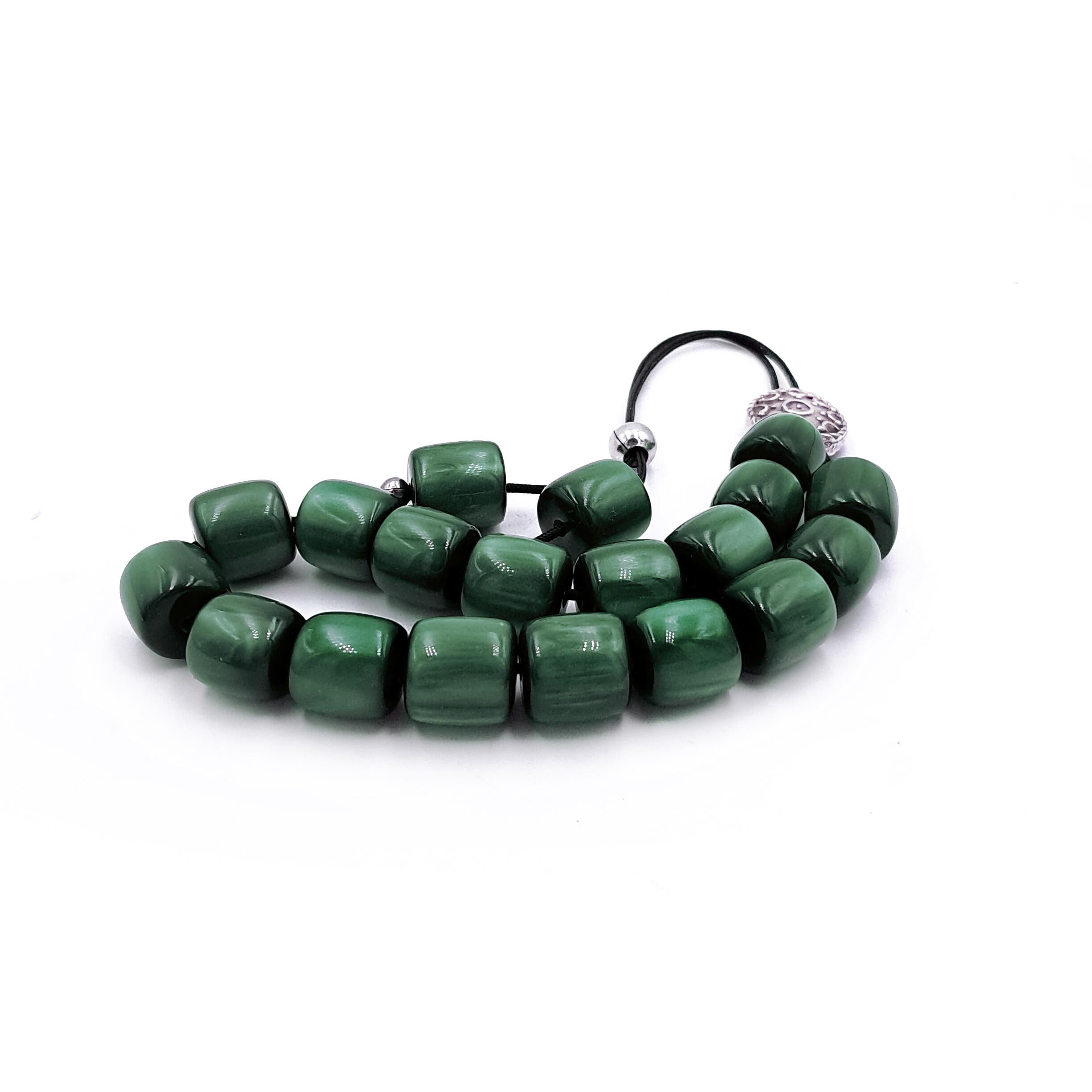 Greek komboloi (worry beads) made with 21 green acrylic barrel beads and a silver-plated metal master bead. A classic set of komboloi, suitable for passing time and relaxation.