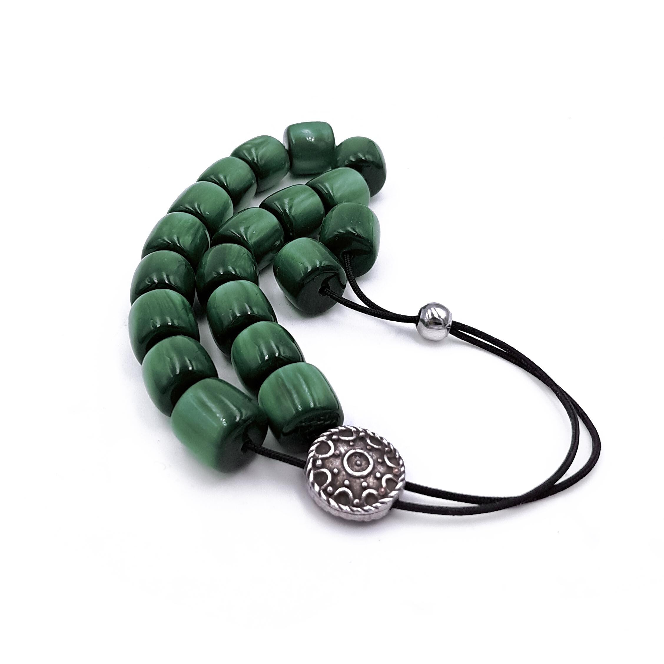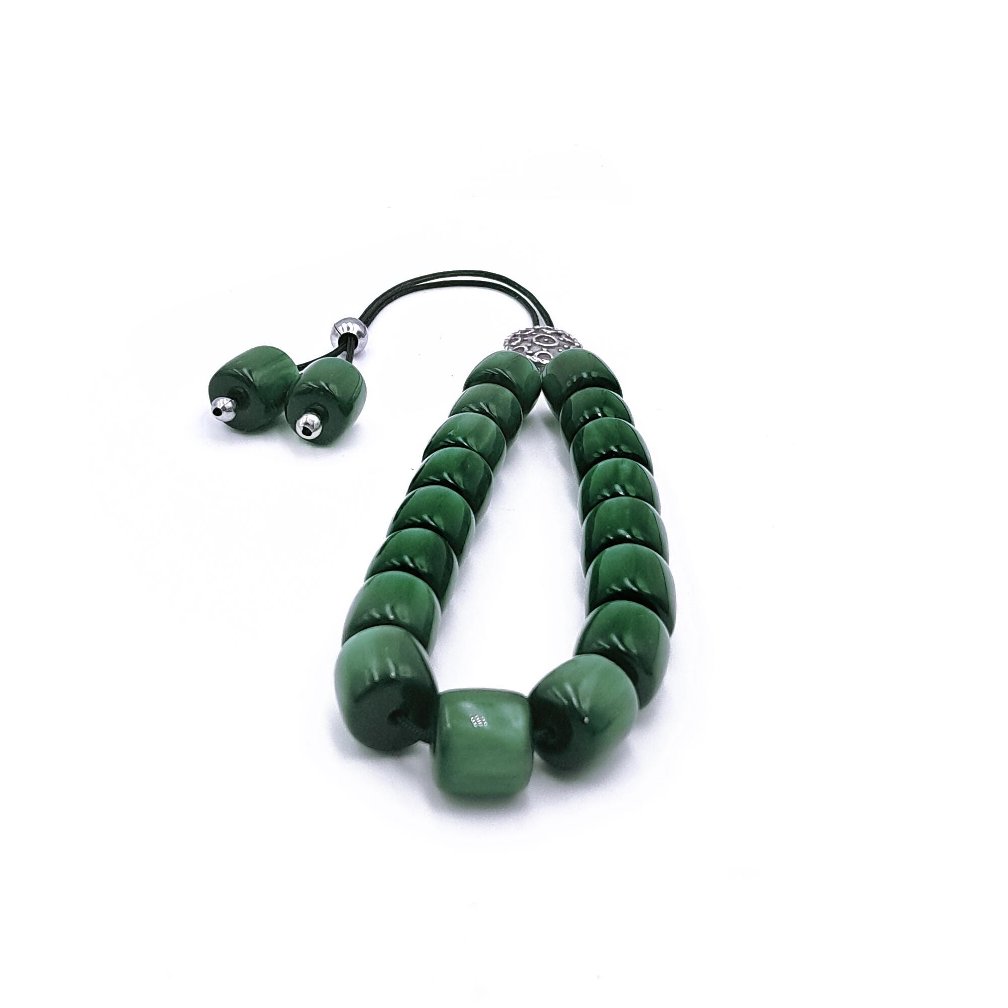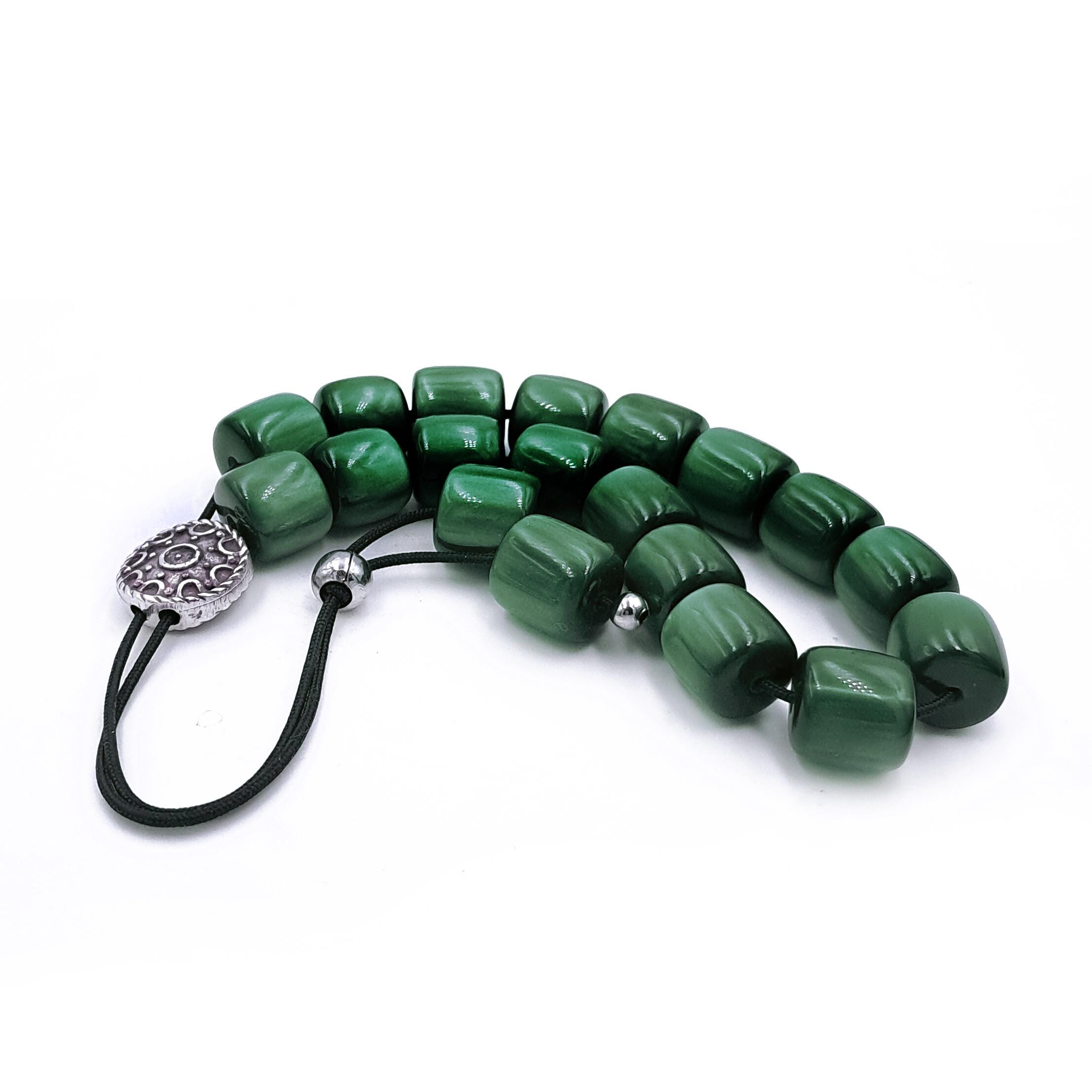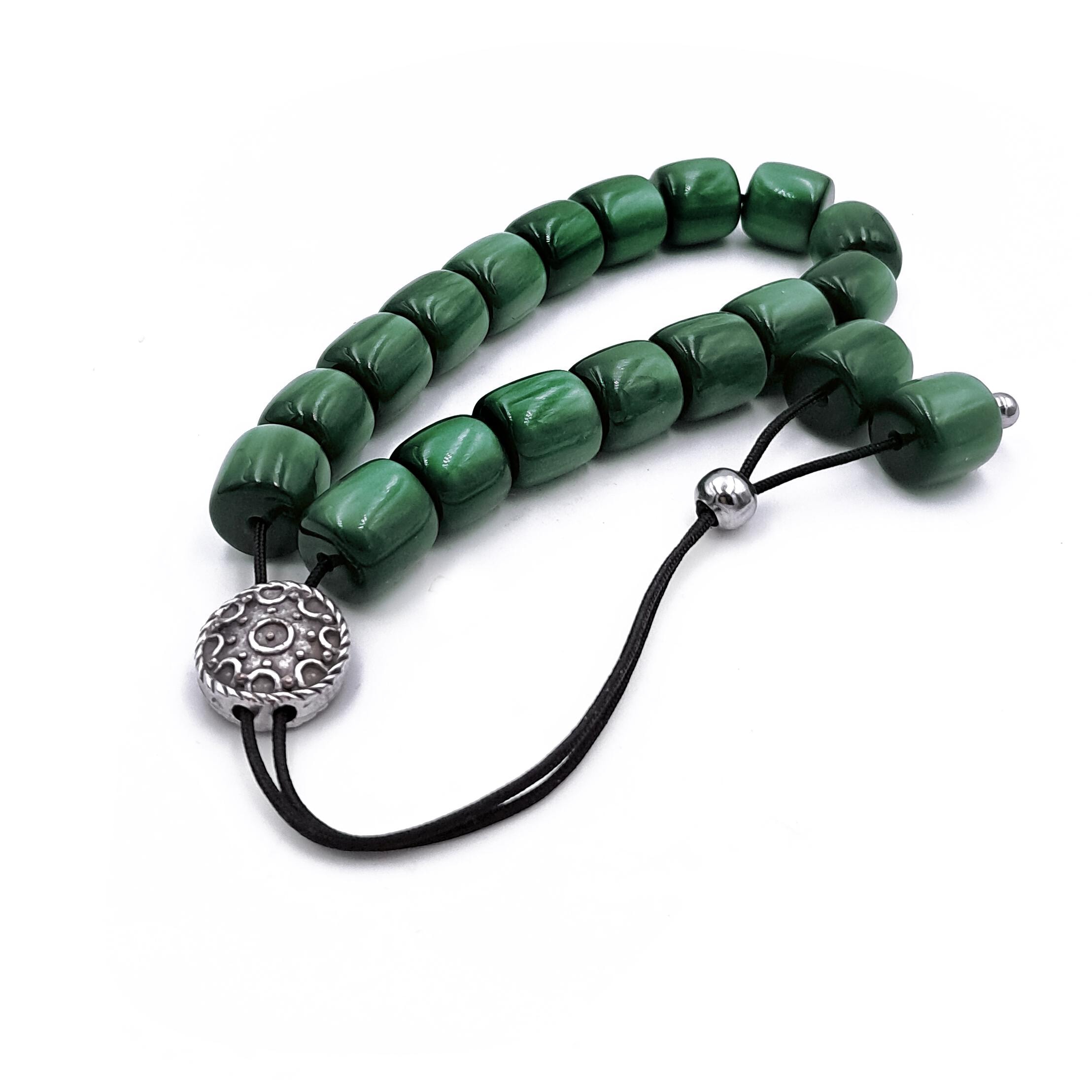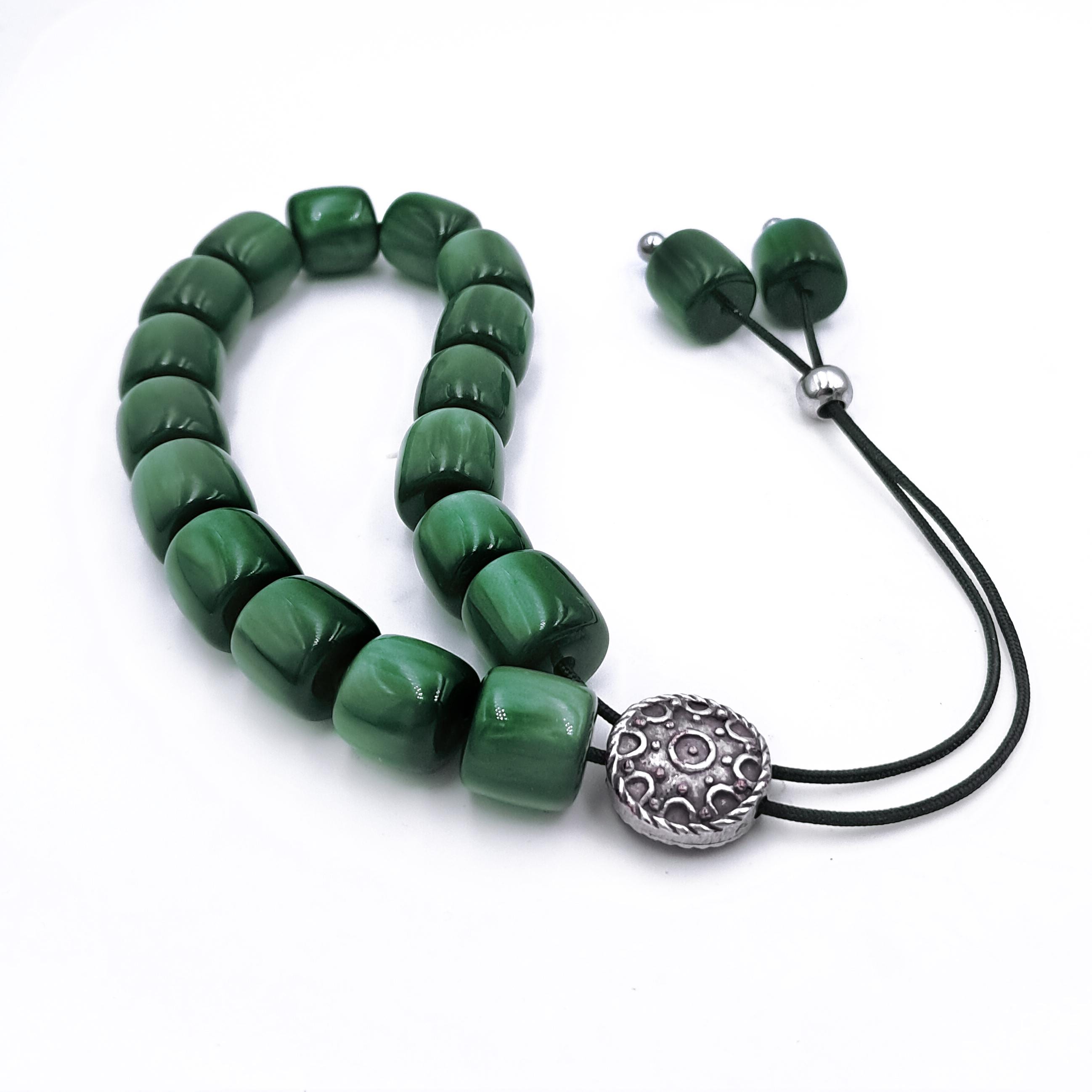 Greek komboloi (worry beads) made with 21 green acrylic barrel beads and a silver-plated metal master bead. A classic set of komboloi, suitable for passing time and relaxation.